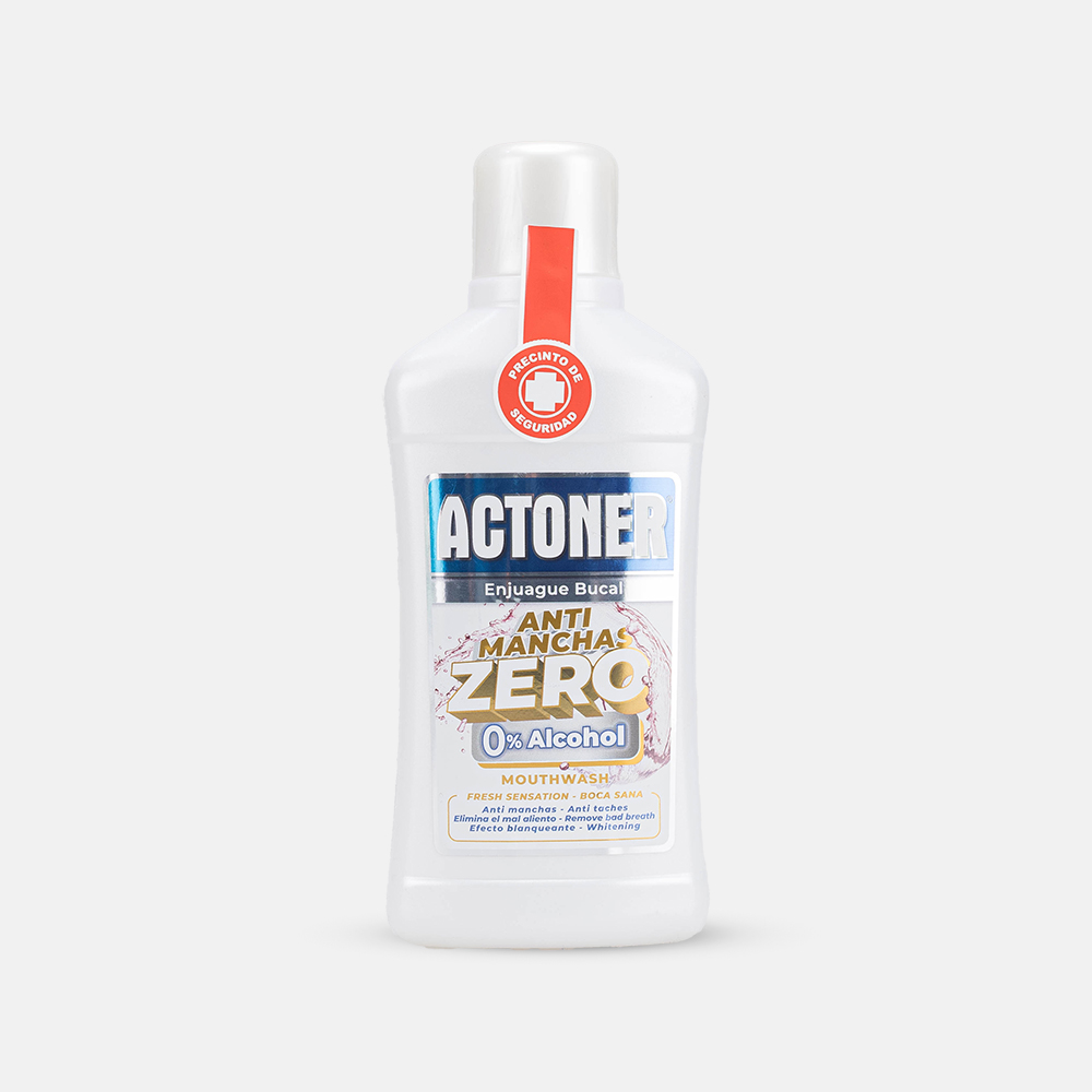 Il s’agit du bain de bouche Actoner Anti-Taches Zéro. Aide à prévenir les taches sur les dents et est sans alcool.